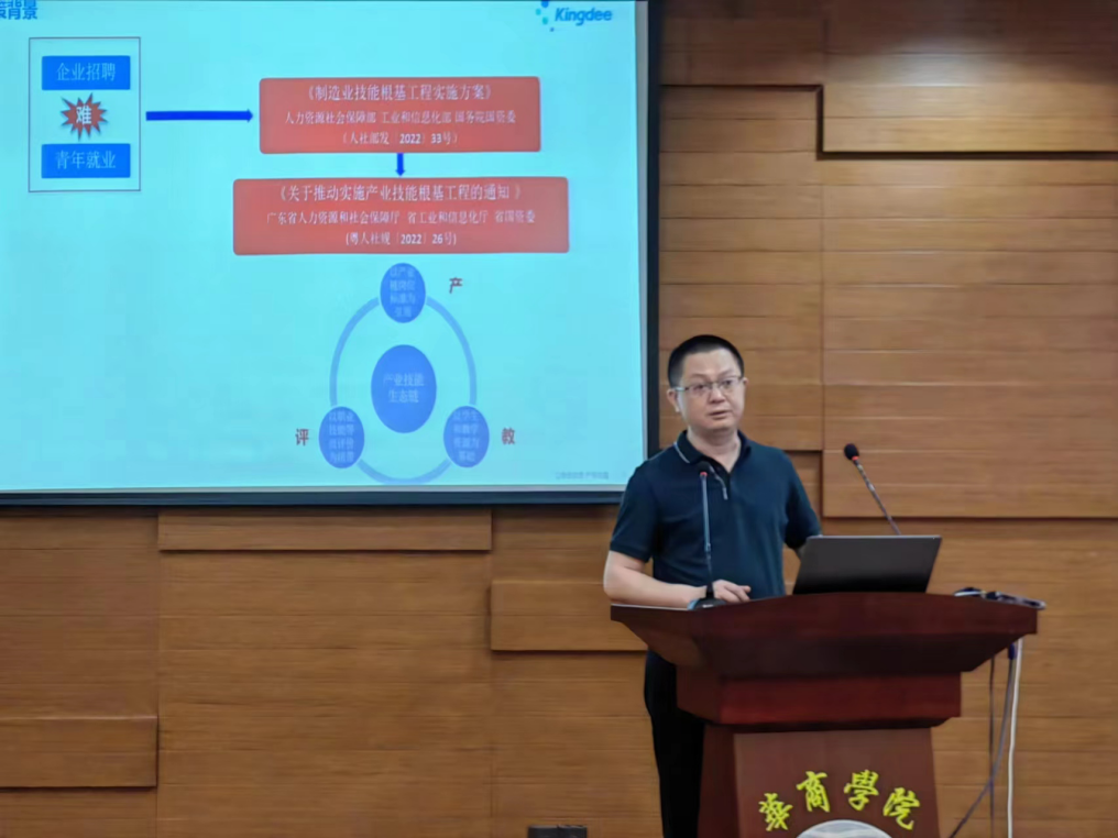 之后,由金蝶精一顾问学院罗万准副院长以“金蝶‘产教评’产业技能生态链人才培养”为主题进行报告,他从政策背景、政策诉求、运作模式、培养计划四个方面对会计类人才培养的必要性及相关路径进行阐述。政府、企业、院校应形成联系紧密的生态链,其中政府应出政策、出资金、出管理,企业应出标准、出岗位、出师傅,院校应出学生、出教师、出教学资源,通过“生态链”的循环,可以在一定程度上促进社会经济发展、解决招聘需求并保障学生就业,最后,他对学院的培养岗位和方向进行介绍,使来宾们对金蝶精一顾问学院的培养模式有了更深入的了解。
