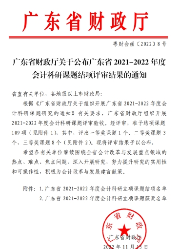 11月15日,广东省财政厅公布了2021-2022年度会计科研课题结项评审结果,本次会计科研课题共有109个通过验收,米兰·官方版在线入口会计学院立项的4个全部通过验收,课题结项通过率为100%。