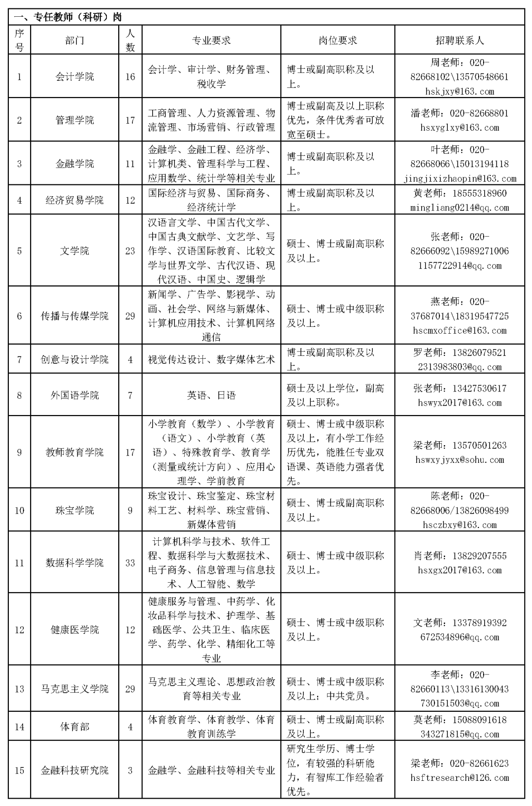 2.专任教师及行政教辅人员:hsrs388@126.com,以及各院系招聘邮箱。