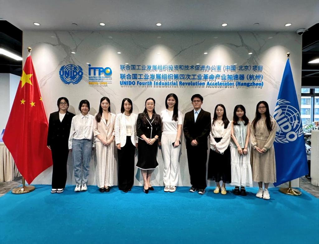 为深化国际化人才培养,助力学生拓展全球视野,系统了解联合国等国际组织的发展历程、运作机制及人才需求标准,2025年5月15日,国际学院组织师生赴杭州参访联合国工业发展组织第四次产业革命加速器(UNIDO)。本次参访由国际学院回雁雁院长、辅导员郝自秀老师带队,23级英语专业石睿妮、23级会计学专业劳雅怡、刘雅文以及24级国际经济与贸易专业刘嘉怡等优秀学生代表随行。参访期间,UNIDO技术官员陆芃芃、张佳文热情接待了代表团,并就相关议题进行了深入交流。