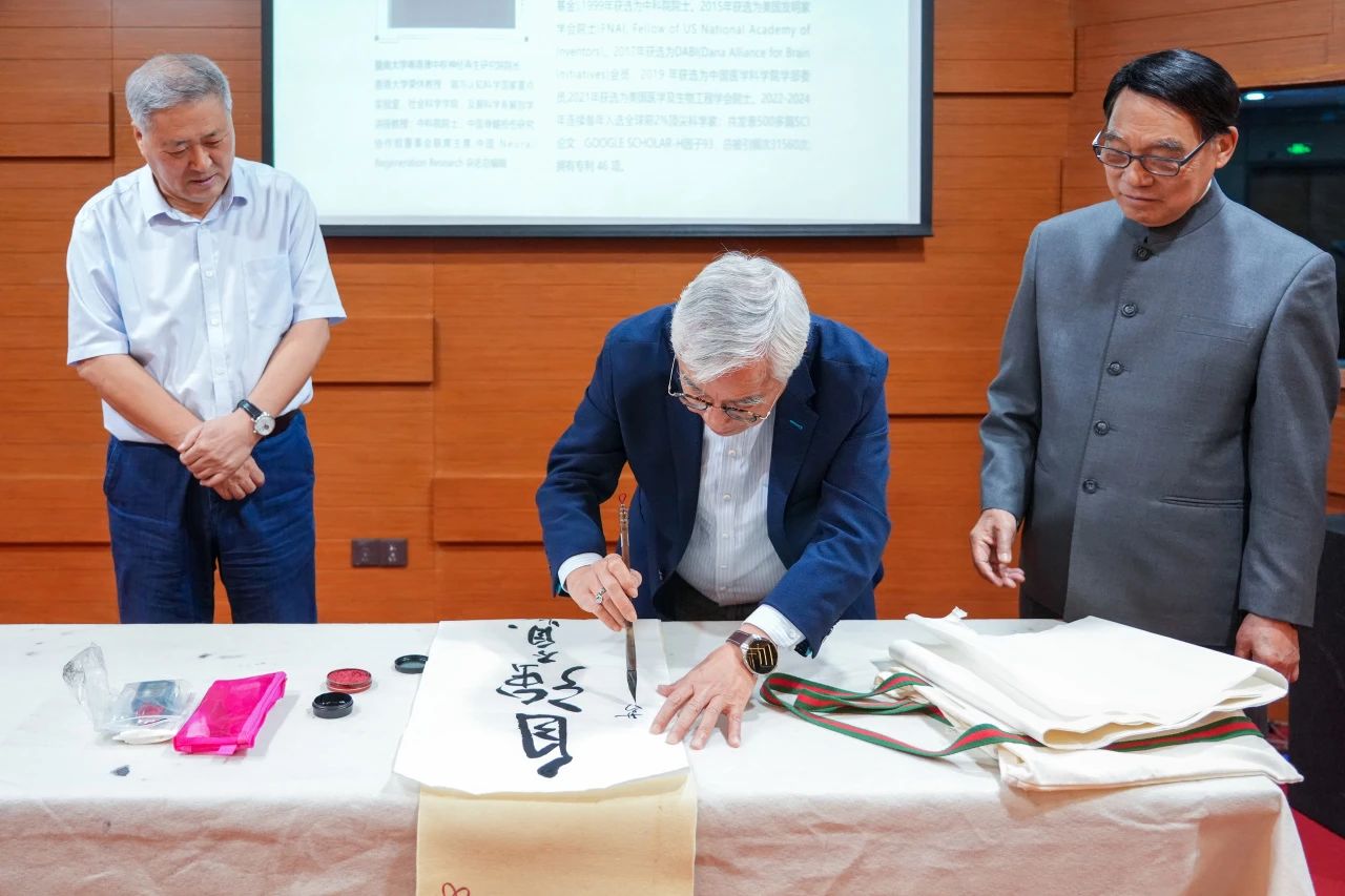 苏国辉院士挥毫赠与我校墨宝,胡军校长代表学校向苏国辉院士赠送刺绣。