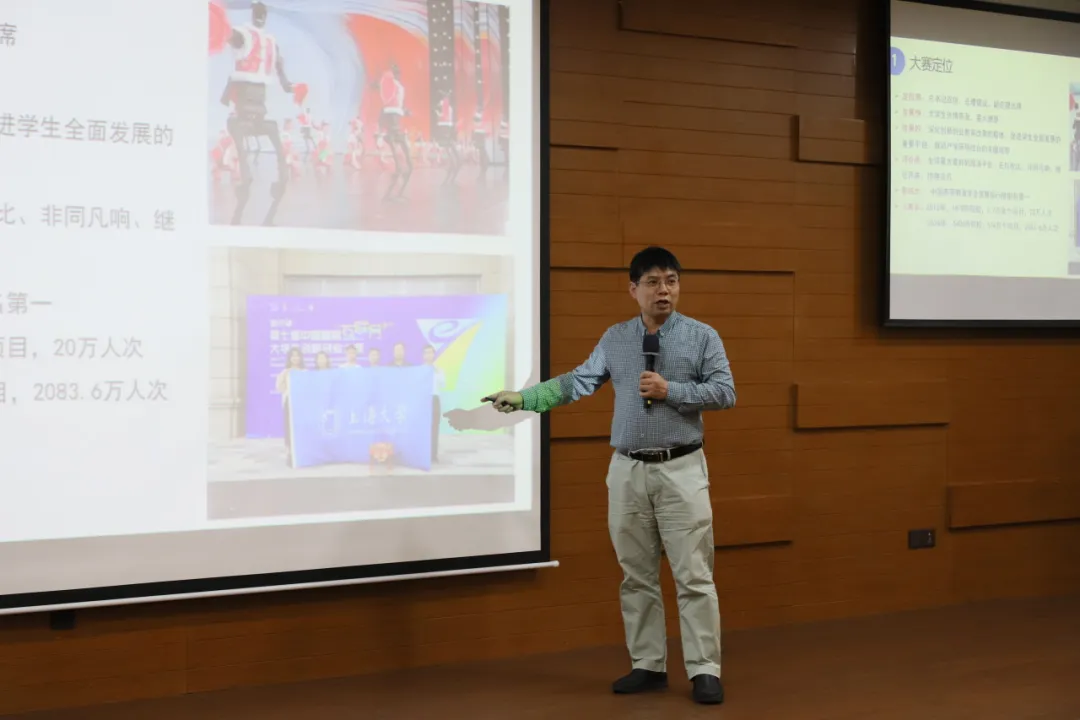 讲座伊始,余院长以宇树科技创始人王兴兴的创业故事与学生进行互动交流,围绕大赛“高教主赛道”“青年红色筑梦之旅赛道”“产业赛道”三大方向展开深度剖析,强调项目选题需立足国家战略需求,强化社会价值导向。
