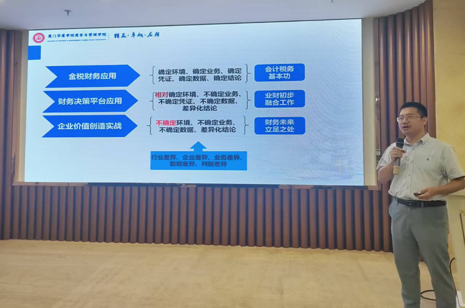 厦门华厦学院商务与管理学院副院长郭文茂副教授进行“以企业价值创造为核心的财会类实践教学体系构建”主题分享。他围绕“金专、金课、金师、金地、金教材”五个方面,深入阐述了“五金”建设发展体系,以数字化教学仿真资源平台为例,探讨全方位财会数字化教育资源开发模式,进而为企业价值创造提供发展方向。