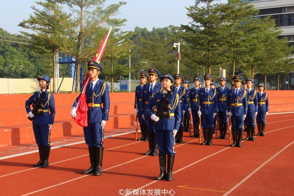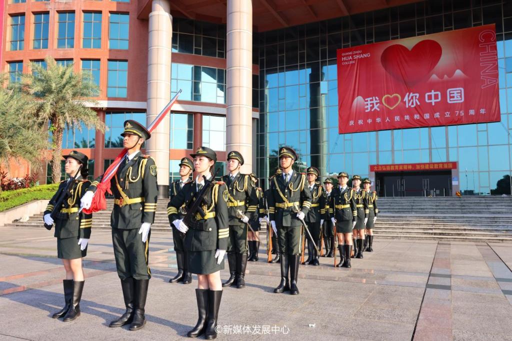 伴随铿锵有力的口令,国旗护卫队队员迈着坚毅整齐的步伐,护送五星红旗走向升旗台。伴随着雄浑高亢的《义勇军进行曲》旋律,全场师生怀着无比崇敬的心情,齐声高唱中华人民共和国国歌,向英烈们致以崇高的敬意和深切的缅怀之情。五星红旗在朝阳中冉冉升起,激昂的旋律回荡在华商校园中。