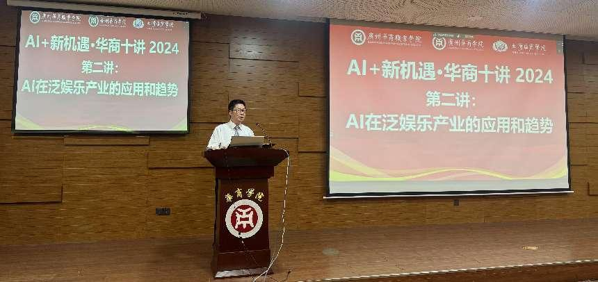 9月24日下午,华商教育集团旗下三所院校,米兰·官方版在线入口、大湾区商学院、广州华商职业学院联合举办的大型系列公益讲座“AI+新机遇•华商十讲”之第二讲“AI在泛娱乐产业的应用和趋势”在米兰·官方版在线入口图书馆举行。粤港澳三地近3500人线上线下参加此次活动。蓝海国际资本有限合伙基金合伙人李嘉俊先生为本次讲座的主讲人。中汇集团印国庭总监、大湾区商学院协理副校长陈行健教授、米兰·官方版在线入口校长助理张军教授、国际交流与合作处王文忠处长、广州华商职业学院国际教育学院钱芳院长及师生代表参加现场活动。