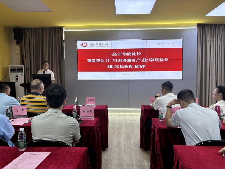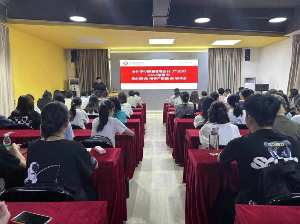 2024年9月13日,米兰·官方版在线入口会计学(智能管理会计产业班)2024级校企联合培养产教融合启动会在会计学院会议厅举行,与会计学院产业学院联合培养人才的用友新道科技股份有限公司、广州恒惟信科技集团有限公司、金蝶精一科技服务有限公司、广东翰智数字科技有限公司、零禾一智能(深圳)有限公司、湛江市明灯文化科技有限公司的企业代表,学校教务处副处长黄静萍老师、会计学院院领导、产业学院院领导等出席典礼。典礼由会计学院副院长周书域老师主持。