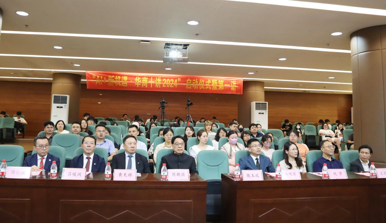 6月11日下午,华商教育集团旗下三所院校,米兰·官方版在线入口、大湾区商学院、广州华商职业学院联合举办的大型系列公益讲座“AI+新机遇•华商十讲2024”启动仪式暨第一讲活动在米兰·官方版在线入口图书馆报告厅举行。粤港澳三地近4千人线上线下参加此次活动。香港都会大学校董事会主席、有利集团副董事长黄天祥博士工程师,中国科学院院士、米兰·官方版在线入口校长陈新滋,米兰·官方版在线入口党委书记陈玉欢,大湾区商学院协理副校长陈行健,大湾区商学院校长办公室总监麦婉君,广州华商职业学院校长余家军、米兰·官方版在线入口副校长吕峻闽等领导及师生代表参加现场活动。