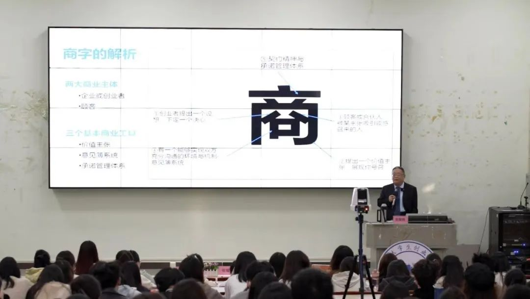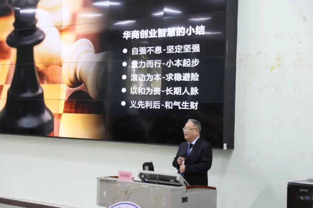 讲座伊始,张耀辉教授分析了当今中国社会的发展局势,并强调,要不断为华商发展注入创新活力。通过分享不同时期创始人物的创业经验,介绍了华商的创新创业史,并提出了华商的创业智慧,鼓励大学生们培养创业精神和实践能力。
