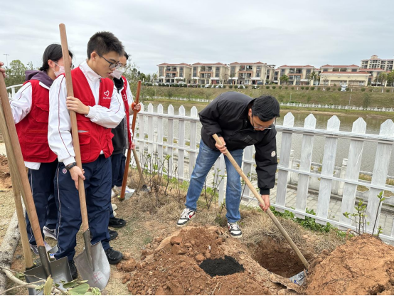 春回大地万物复苏,植树添绿正当时。2月27日下午,增城区总工会联合荔湖街在太平都市农业公园开展“携手添新绿,共植职工林”广州职工公益林增城片区2024年首场植树活动。为深入学习贯彻彻习近平生态文明思想,助力省“百千万工程”和绿美广东生态建设,引领华商青年担当力行、服务社会,我校团委组织10余名学生志愿者参与本次活动。