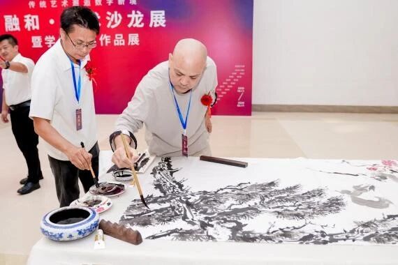郭湘黔教授以《用笔触传递温度》为题,分享四十年“从设计到国潮”的实践路径,强调“民族即国际”的东方美学传播理念。李喻军教授以《从书写到抒写》为题,提出书法“由技入道”的三重跨越,现场展示“春花·夏日·秋月·冬雪”四季主题创作。蓝达文教授以《以创作实践为舟,以美育理念为桨》为题,结合闽南地域案例,剖析本土文化自信的当代转化。李沃源副院长以《国画中的写生意境》为题,倡导“外师造化,中得心源”,并以阿里山、田园渔港写生为例,解析“守正创新”的水墨精神。李元庆教授以《中国画的抽象形态研究》——提出“精灵绘画”概念,探讨心性、直觉与东方哲学在全球化语境下的抽象表达。冼一凡艺术家分享美展获奖作品《点点繁星》创作解析,画作为父女联袂创作,以绢本金箔、撞水积染再现广州夜色,致敬城市变迁。莫金水主席浅谈艺术作品《九如图》创作过程,画作以荔枝、锦鲤传统吉祥意象,诠释《诗经》九如祝颂与岭南非遗文化。陈涵懿博士分享《当经典遇见代码》,现场演示《行走的清明上河图》、《卧游千里江山图》等数字交互案例,提出“让经典成为入口,而非终点”的艺术理念。
