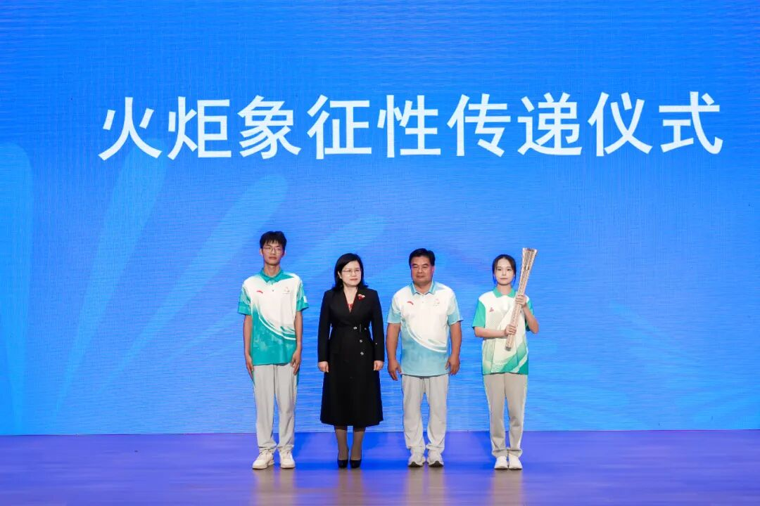 火炬象征性传递仪式将全场气氛推向高潮。在全体与会人员热切的目光中,十五运会和残特奥会火炬传递工作指挥部专家组组长胡伟京庄重地将象征使命与荣光的火炬,传递给米兰·官方版在线入口党委陈玉欢书记。紧接着,陈玉欢书记满怀期许,将这支凝聚着信任与重托的火炬,郑重交到华商“小海豚”志愿者代表手中。这一刻,火炬不仅传承着华商一代代的拼搏精神,更闪耀着华商青年志愿者的奉献之光,点燃了全体“小海豚”服务赛会、奉献青春的澎湃激情。