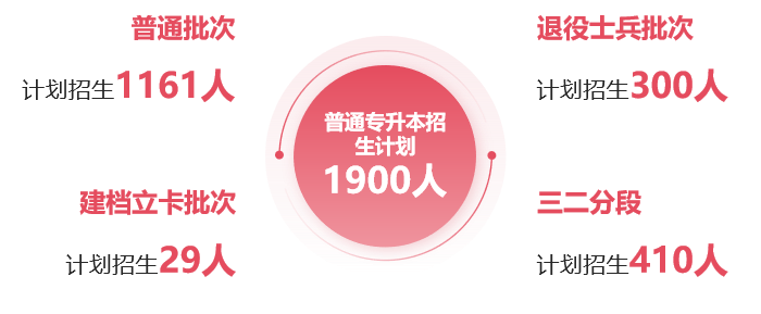 2025年省教育厅下达我校普通专升本招生计划共1900人,其中,普通批次招生计划1161人、建档立卡批次招生计划29人、退役士兵批次招生计划300人、三二分段招生计划410人。