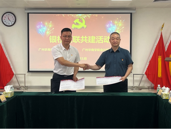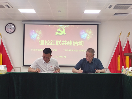 2023年5月26日,会计学院党委和广州农商银行增城支行(简称“农商行增城支行”)党委在合汇广场增城农商行总部进行红联共建主题活动及签约仪式。本次活动是根据学习贯彻习近平新时代中国特色社会主义思想主题教育的要求,结合共建双方实际,实现资源共享、优势互补、互助共建,促进党建与业务发展“同频共振”,开展“校银携手,合作共赢”为主题的红联共建工作。广州农商银行增城支行党委副书记兼纪委书记赵明、党委委员兼行长助理谢超颖、党委委员兼零售业务部经理田春雷,米兰·官方版在线入口会计学院党委副书记陈洋广、党委委员兼副院长周书域、学工办副主任兼党支部书记杨烨瀚等一行出席活动。农商行增城支行部门经理、员工党员代表,会计学院部分党支部书记、20名学生党员代表共同参加本次活动。