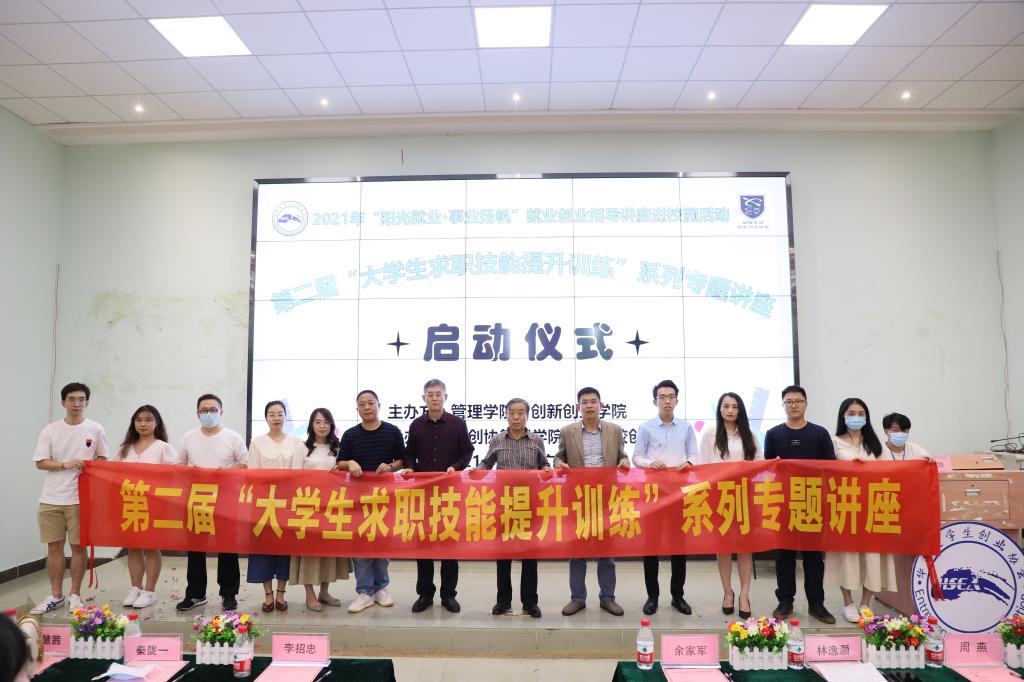 2021年10月19日,由管理学院与创新创业学院联合主办的2021年“阳光就业·事业扬帆”就业创业指导讲座进校园活动第二届“大学生求职技能提升训练”系列专题讲座启动仪式在励志楼C408举行。管理学院院长李招忠教授、副院长秦陇一教授、创新创业学院常务副院长兼管理学院副院长余家军副教授、创新创业学院办公室主任周燕老师,活动策划人管理学院杨剑老师、创新创业学院吴拯宪老师,创新创业学院谢根仁老师、陈欢老师,主讲嘉宾代表杨惠茜老师、廖梦玲老师、广州小黑科技有限公司CEO林逸灏先生等共计11人出席启动仪式。