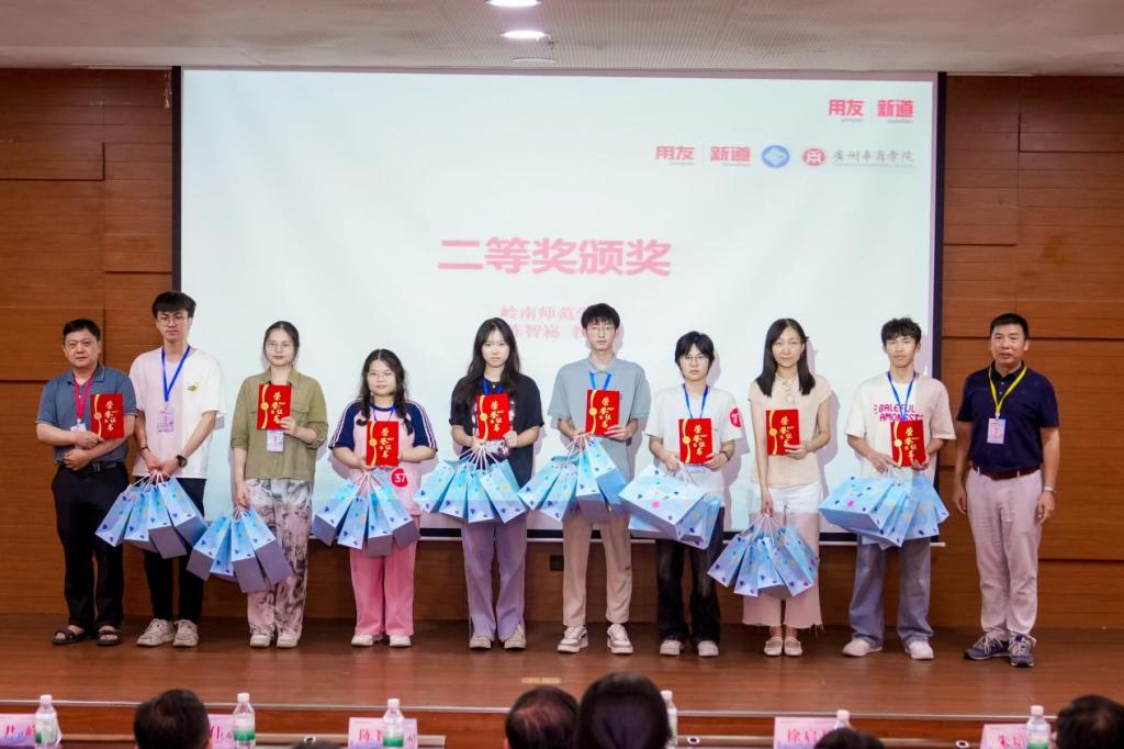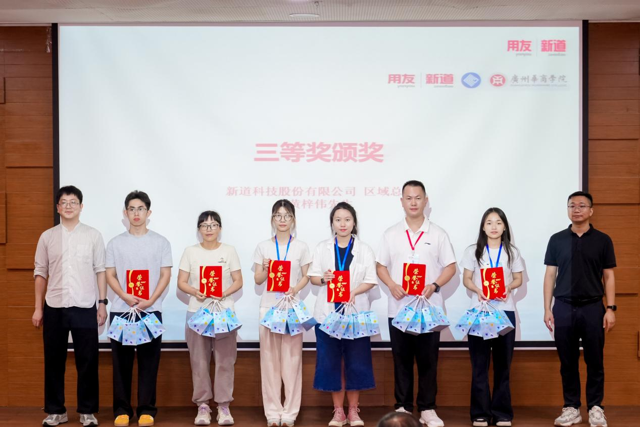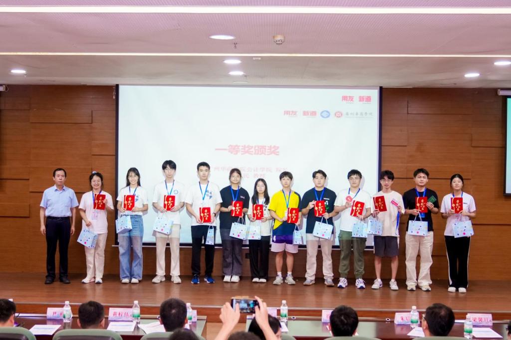 姚凤民院长陈智崧裁判长、服务总监徐启超、新道科技股份有限公司区域总监黄梓伟分别为获奖队伍颁奖。获奖选手手持证书与奖杯,脸上洋溢着喜悦与自豪,现场掌声不断。