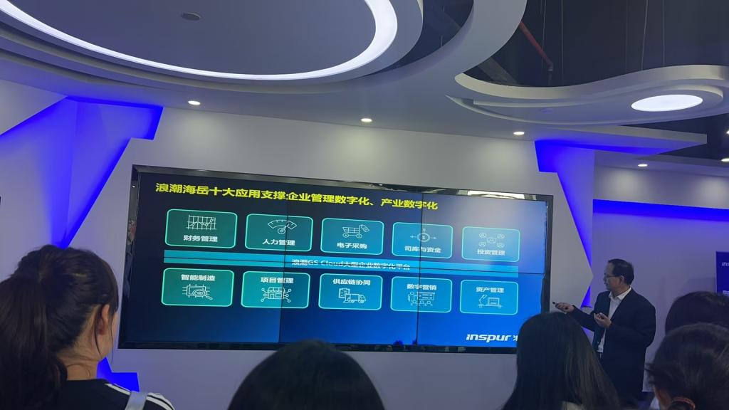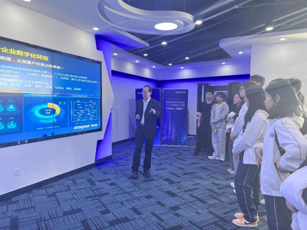 参访活动形式丰富多样,旨在让师生们深入了解企业的运作和行业的前沿动态。在浪潮公司展厅,柴斌副总带领师生进行参观学习。展厅中,各种先进的技术产品和解决方案令人目不暇接。从高性能服务器集群到智能化云服务架构,从大数据精准分析系统到AI驱动的行业应用模型,浪潮于信息技术领域的斐然成就与创新硕果逐一呈现,科技魅力扑面而来,令师生真切触摸时代科技最强脉搏。